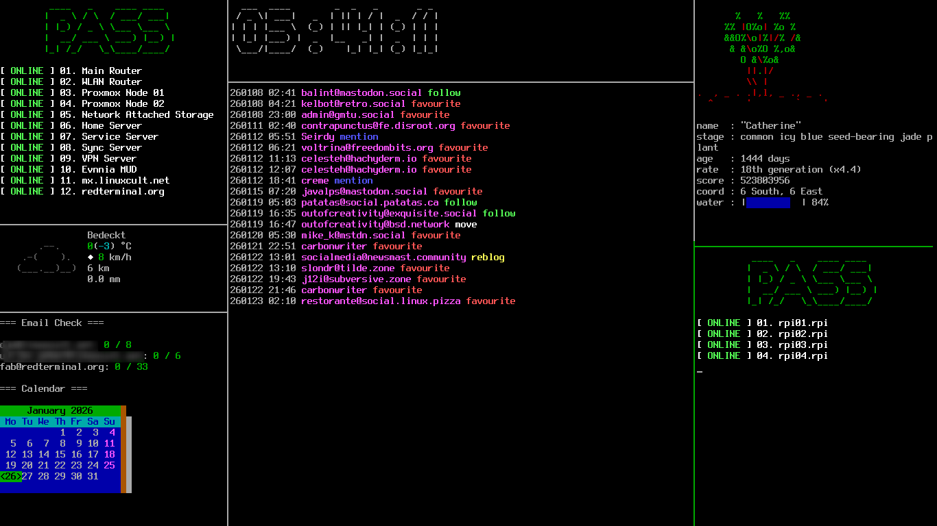 I have an infoscreen in my room, which serves all kinds of information about my home network and other things. It shows if all services are up, a local weather report, if there are new emails, a figlet clock, my Fediverse notifications, my Gemini Astrobotany plant and the status of my 4x Raspberry Pi 4 Incus cluster.